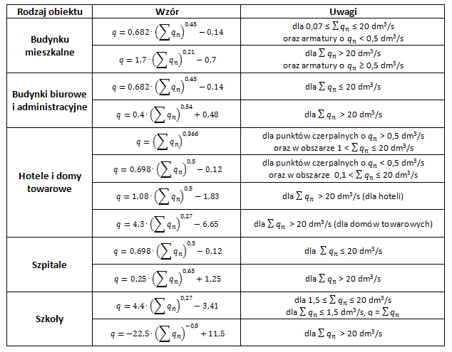 Tabela 1. Wzory do określenia przepływów obliczeniowych w instalacjach wodociągowych dla różnych rodzajów budynków. Źródło: PN-92/B-01706