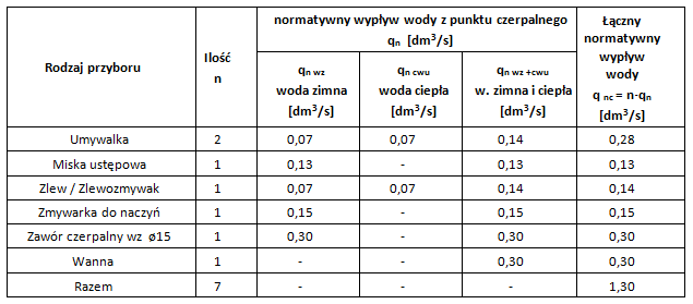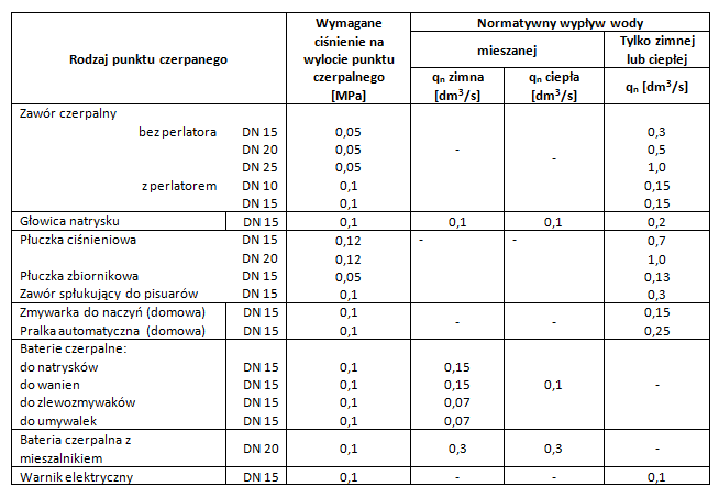 Tabela 2 Wypływy normatywne dla punktów czerpalnych. Źródło: PN-92/B-01706