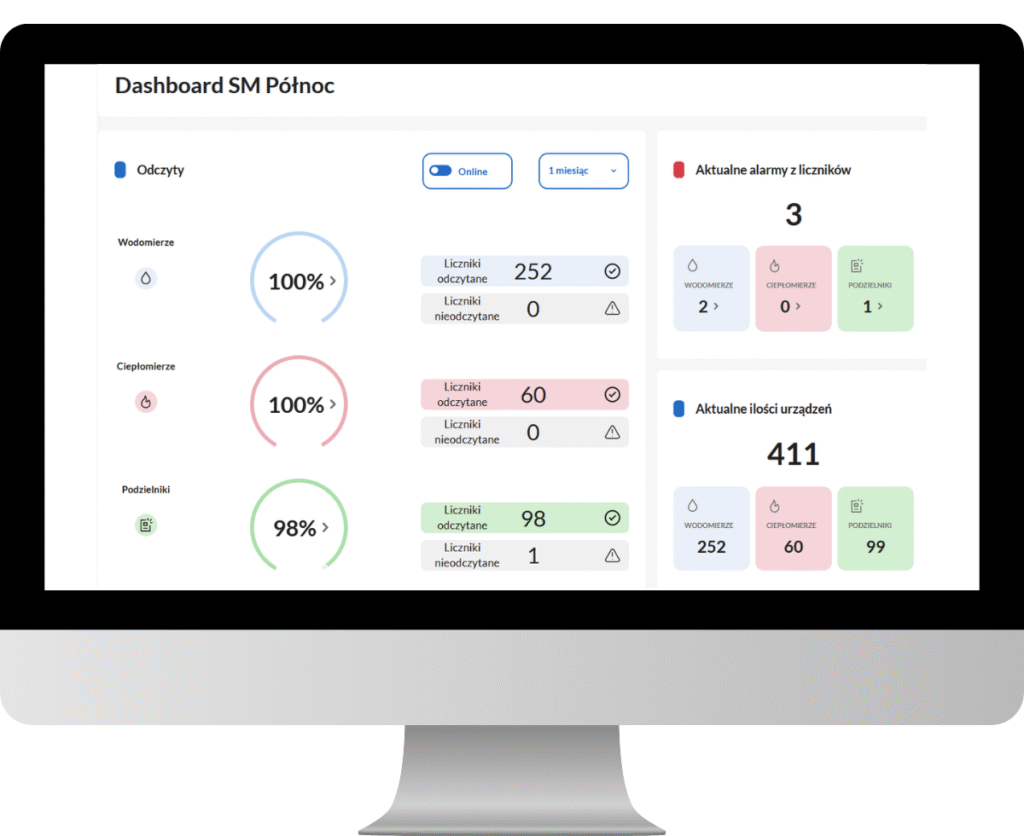 Kompleksowa obsługa urządzeń pomiarowych portal wspiera wodomierze, ciepłomierze i podzielniki kosztów ogrzewania, co oznacza, że masz wszystkie dane z różnych typów liczników w jednym, spójnym systemie, upraszcza to zarządzanie i eliminuje potrzebę korzystania z wielu platform.