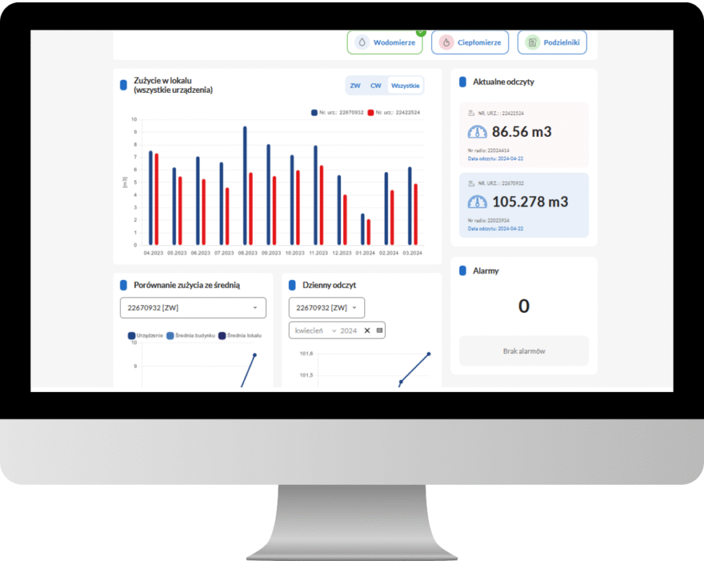 Dostęp dla mieszkańca – aktualne wskazanie urządzeń i ilość ich alarmów, wykresy zużycia miesięcznego, porównania ze średnią budynku oraz rok do roku, wykres wskazań rejestrowanych codziennie (odczyt online).