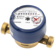 Wodomierz suchobieżny, wyposażony w 8-bębenkowe liczydło oraz nadajnik impulsów.