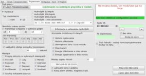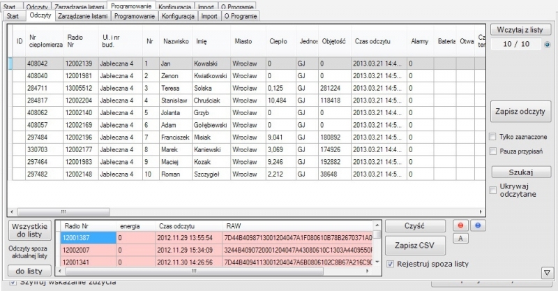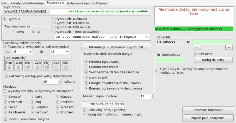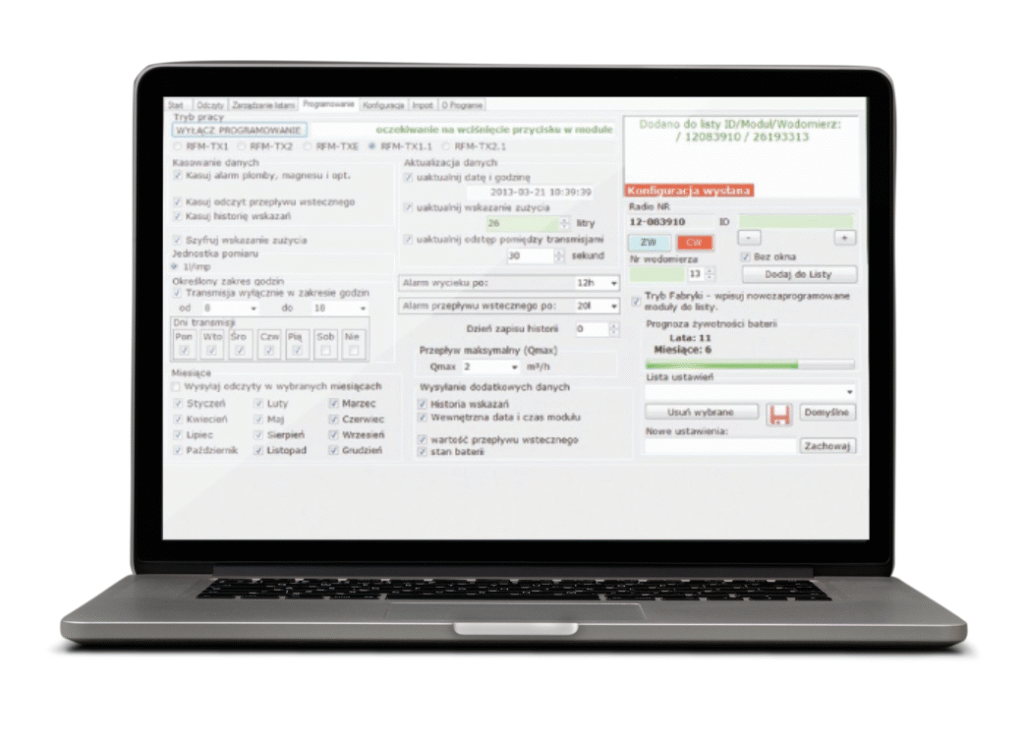 Alarmy: Program sygnalizuje następujące zdarzenia: uszkodzenia czujnika temperatury. nieprawidłowości przy naliczaniu zużycia czynnika grzejnego lub chłodzącego, otwarcie obudowy ciepłomierza. niski stan baterii, przepływ wsteczny oraz przekroczenie przepływu maksymalnego.