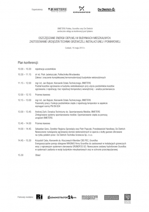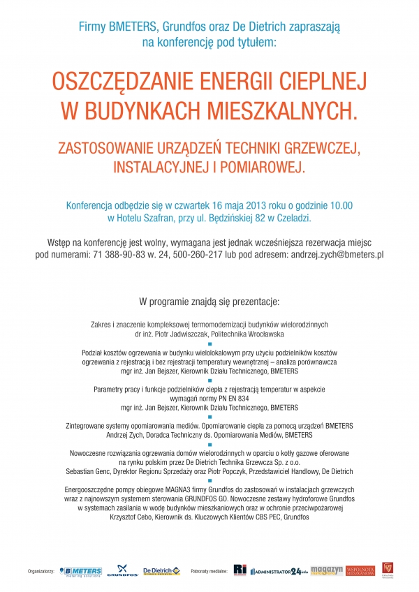Konferencja ta będzie dla przedstawicieli spółdzielni mieszkaniowych i zarządców nieruchomości, doskonałą okazją do poszerzenia swojej wiedzy z zakresu oszczędzania energii cieplnej w budynkach mieszkalnych, a także możliwością do interesujących rozmów z profesjonalistami z firm takich jak BMETERS, De Dietrich, Grundfoss oraz Politechniki Wrocławskiej.