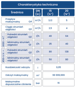 DOKŁADNOŚĆ – Wodomierz GSD5-R produkowany jest w klasie dokładności R100H-R50V. Dostępny w średnicach DN15-DN20.