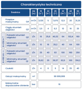 DOKŁADNOŚĆ – Wodomierz precyzyjnie mierzy przepływ nawet przy niskich natężeniach dzięki technologii odczytu indukcyjnego i zoptymalizowanej turbinie. Możemy go montować w dowolnej pozycji. Klasa dokładności: R250H-R160VH. Dostępny w średnicach DN15-DN50.