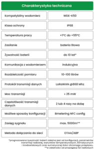 *prognozowana żywotność baterii zależna jest od konfiguracji, parametrów transmisji radiowej, warunków temperaturowych, klimatycznych i środowiskowych oraz sumarycznej ilości zliczonego przepływu.