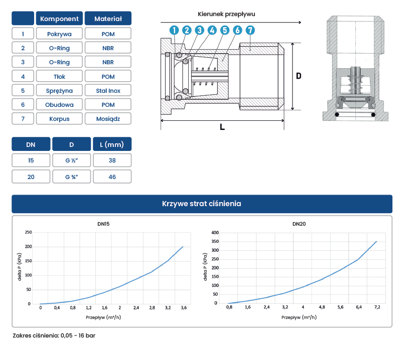 Łącznik śrubunku BKM z wbudowanym zaworem zwrotnym stanowi element instalacji za wodomierzem, zapobiegając niepożądanemu przepływowi wstecznemu. Urządzenie zaprojektowane do pracy w systemach o ciśnieniu roboczym mieszczącym się w przedziale od 0,05 bar (minimum) do 16 bar (maksimum). Do wodomierzy o średnicy od DN15 do DN20.