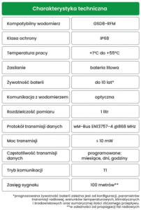 PRZESYŁANIE DANYCH – Moduł RFM-TX1.1 IP68 przesyła dane w standardzie wM-Bus EN13757-4 @868 MHz ≤ 10 mW, tryb komunikacji T1.